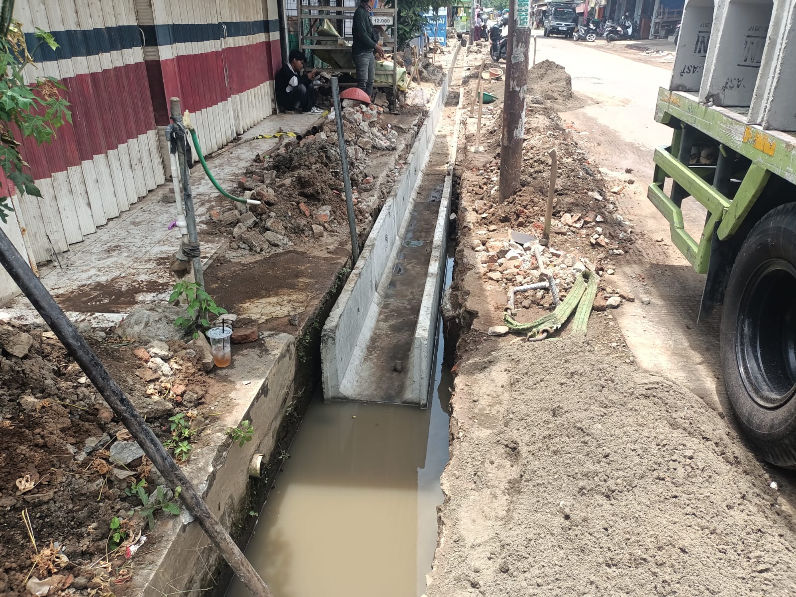 Saat dikonfirmasi, salah seorang pekerja di lokasi proyek mengakui bahwa kondisi banjir saat pemasangan menjadi kendala. “Ya, Pak, ini banjir kan tadi habis hujan, jadi ya gini pemasangannya. Untuk pekerjaan sudah enam hari, kalau enggak salah pengawasnya Pak Rohim,” ujarnya.