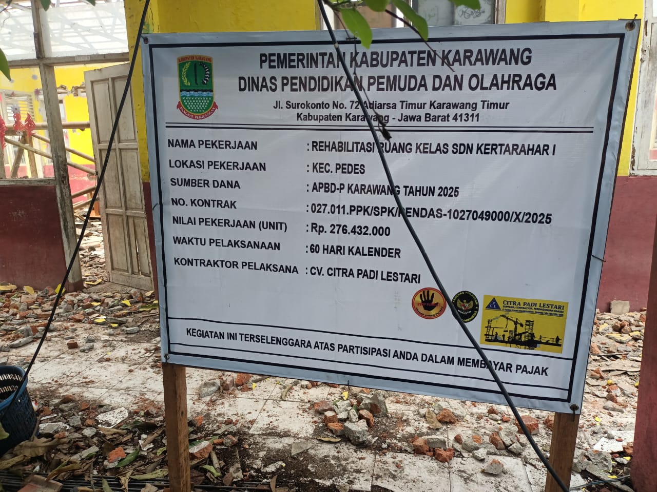 Karawang || Patriotjabar.com — Proyek rehabilitasi ruang kelas SDN Kertaraharja I, Kecamatan Pedes, Kabupaten Karawang, senilai Rp. 276.432.000 yang bersumber dari APBD Karawang tahun anggaran 2025, kini menuai sorotan tajam dari masyarakat. Pasalnya, pekerjaan yang dilaksanakan oleh CV. Citra Padi Lestari itu diduga kuat tidak sesuai dengan spesifikasi teknis (spek) dan berpotensi menjadi ajang penyimpangan anggaran.